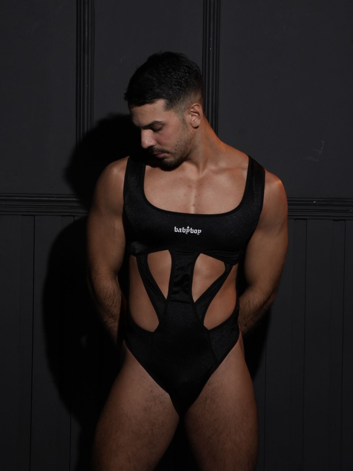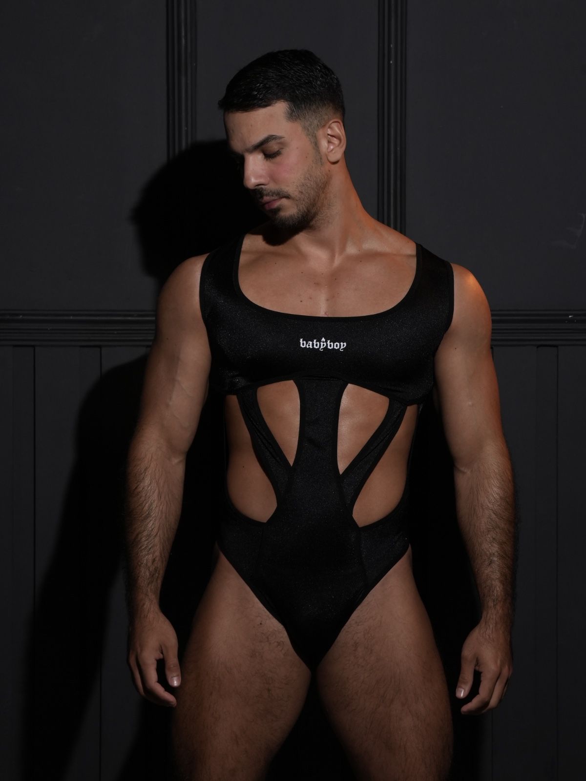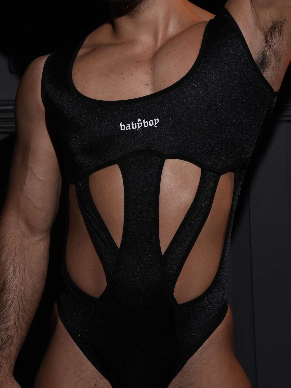 Body elaborado en base de nylon – spandex, con cut-outs en el frente que permiten ver la piel. Mini logo estampado en Transfer en la parte delantera y cuello cuadrado. Lenceria para hombres.