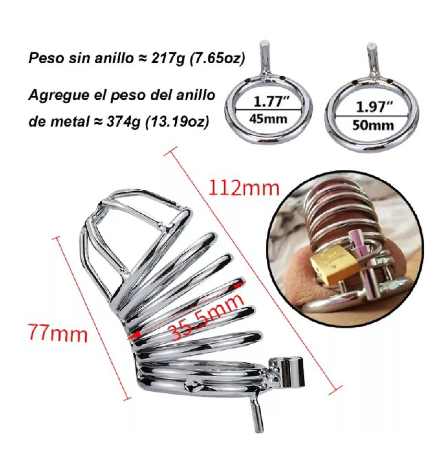 El aro mide 5 cm de diámetro, la sección de la jaula tiene un largo de 6 cm y desde la base la longitud llega a los 8 cm, con un poco de determinación cualquier miembro dormido puede acomodarse en estas dimensiones.